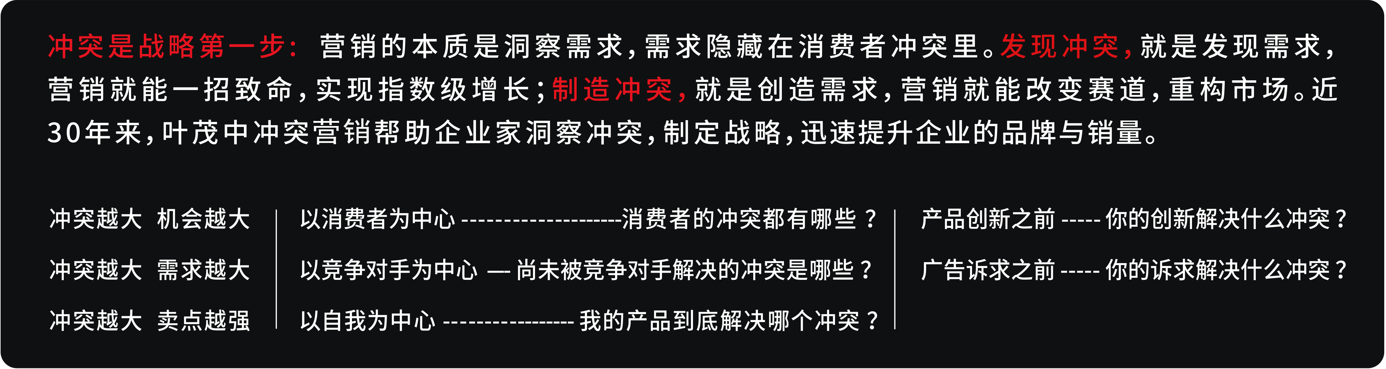 沖突是戰略第一步: 營銷的本質是洞察需求,需求隱藏在消費者沖突里。發現沖突,就是發現需求,營銷就能一招致命,實現指數級增長;制造沖突,就是創造需求,營銷就能改變賽道,重構市場。近30年來,葉茂中沖突戰略幫助企業家洞察沖突,制定戰略,迅速提升企業的品牌與銷量。